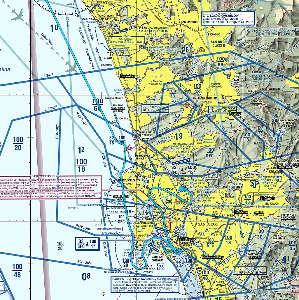 The route we were flying took us near Mount Soledad, Crystal Pier, OB Pier (basically the entire shoreline and beaches down) and circle back in the canal next to the city, 180 just past the Coronado Bridge and fly over San Diego International Airport before turning and landing at our destination that day at Montgomery.